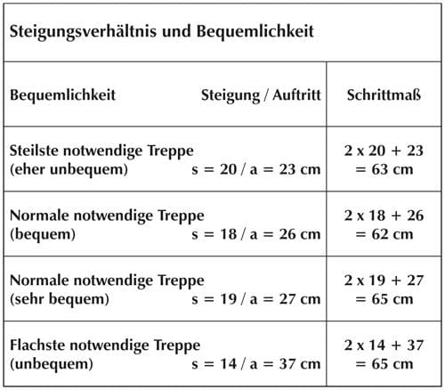 Die Schrittlänge verkürzt sich beim Treppensteigen um das 2-fache der Höhe. Wenn man 10 cm hochsteigt, beträgt die horizontale Schrittlänge nur noch 43 cm (bei 18 cm noch 27 cm). Dadurch ergibt sich ein empfehlenswertes Steigungsverhältnis 18/27 cm für Treppen.
